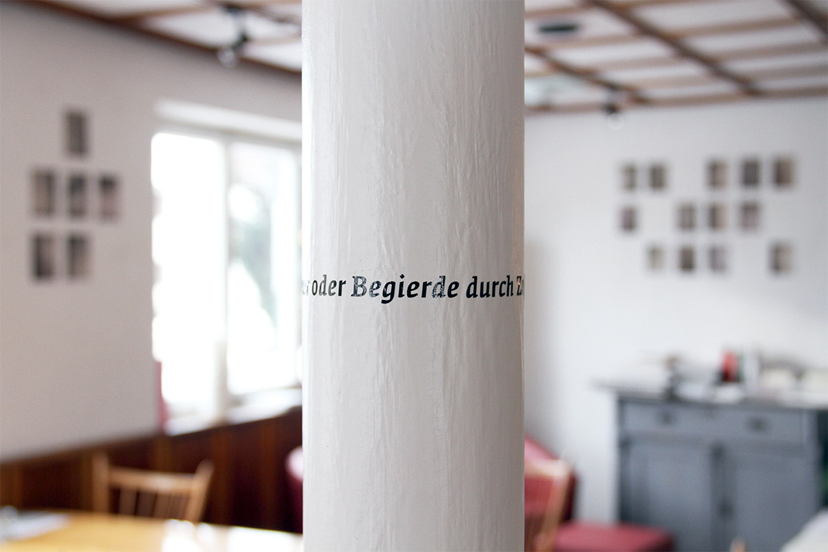 Beim Aufbau wurde uns klar, dass wir der Strenge der Umsetzung und der Egozentrik des philosophischen Systems etwas entgegensetzen möchten. So entstand der Text im Nebenraum