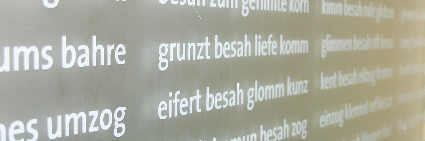 Für die Glaswände in den Gängen des Bürgerhauses in Bregenz sollte ein Sichtschutz gestaltet werden. Unsere Idee: auf einem Band aus Milchglasfolie einen Text durch die drei Stockwerke des Gebäudes in immer neuen Buchstabenkombinationen laufen zu lassen.