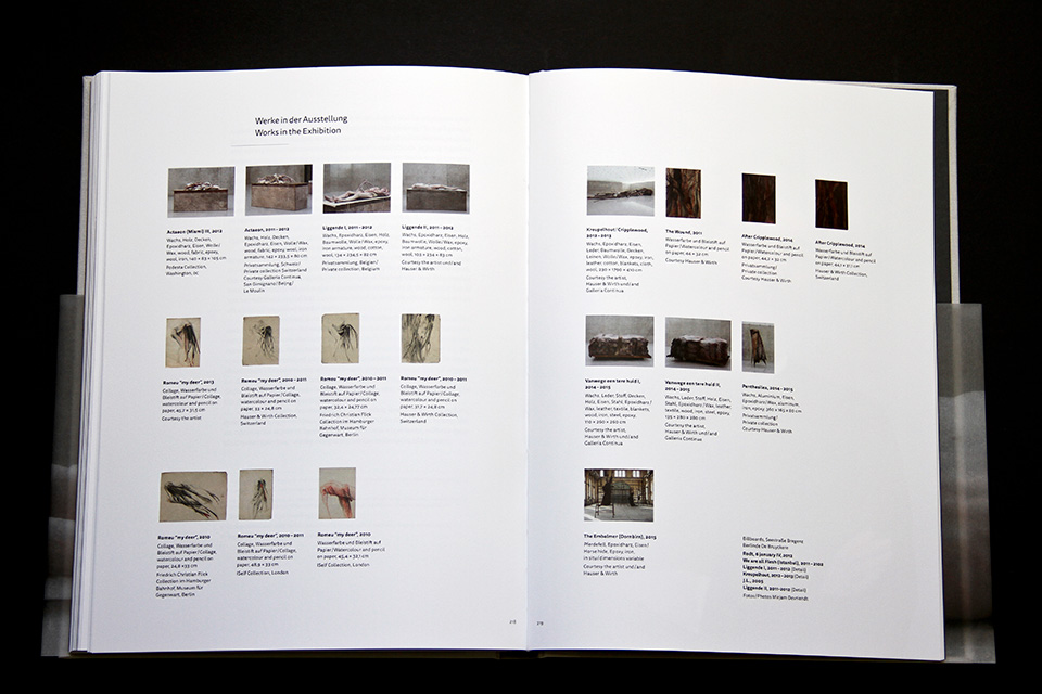 Das Katalogbuch begleitete die Ausstellung, die mit unterschiedlichen Schwerpunkten im Kunsthaus Bregenz und im Kunstraum Dornbirn gezeigt wurde. Die Künstlerin arbeitet mit Abgüssen aus Wachs und Kunstharz nach Bäumen, Tieren und Menschen, deren durchscheinende Oberfläche darunterliegende Farben und Strukturen sichtbar macht.