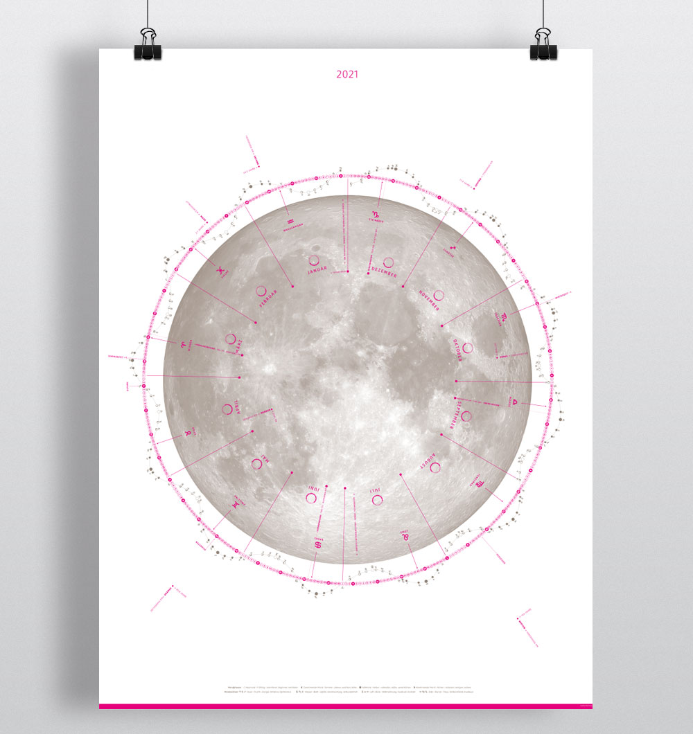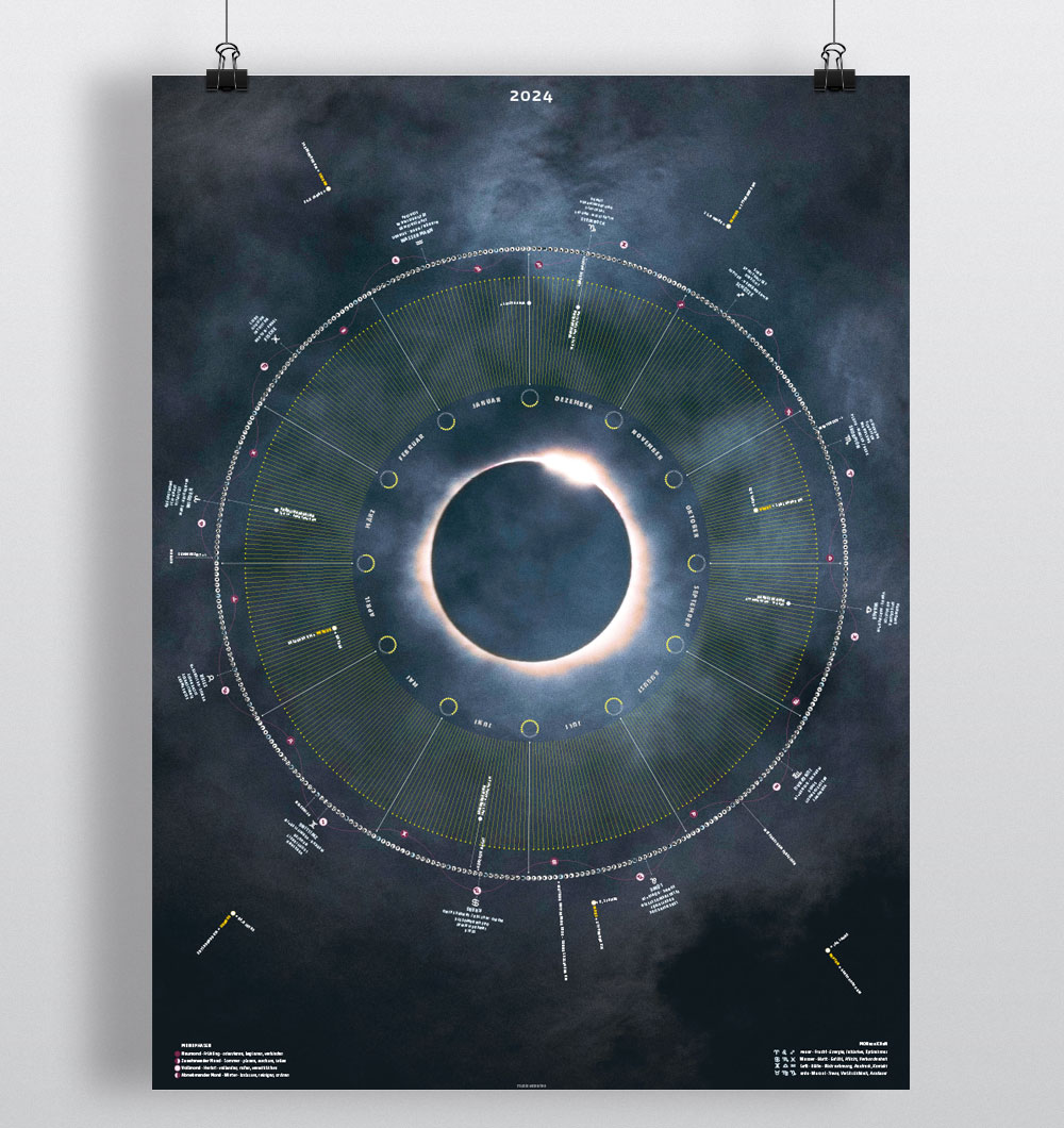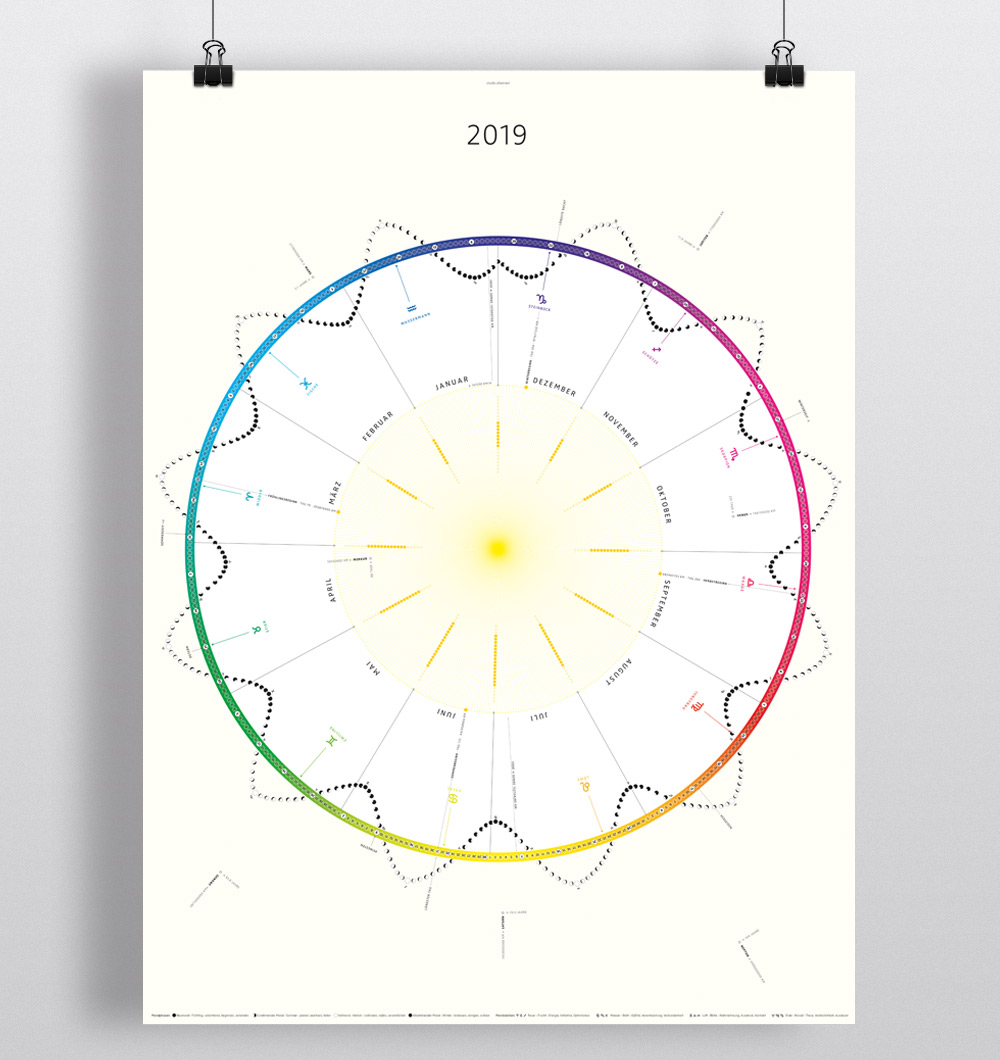 Jahreskalender mit Mondphasen und Sternzeichen, Sonnenstunden, Planetendaten, Jahrestage ...