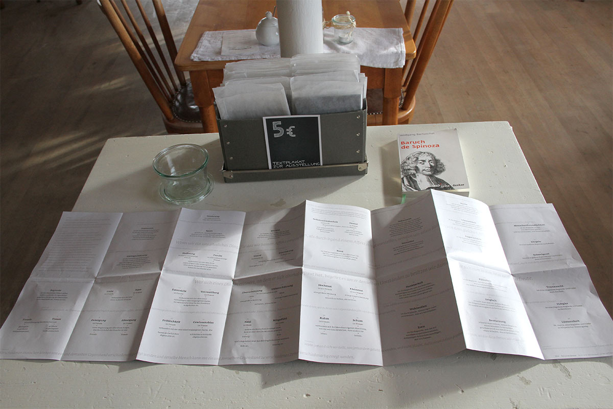 In einer Arbeitswoche in Berlin entwickelten wir Ideen, uns den 48 Affekten/Gefühlen, die Spinoza im dritten Teil seiner Ethik definiert, mit einem künstlerischen Zugang zu nähern. Längere Texte an die Wänden zu projizieren schied aus, zu ungern verlassen die Inhalte das Papier. Es sollte keine Arbeit über Spinoza entstehen, weder seine Philosophie erklären noch eine inhaltliche Interpretation anbieten. Stattdessen