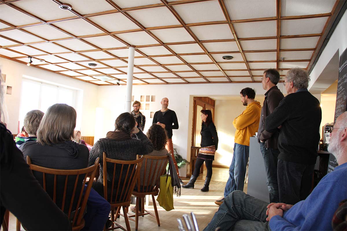 Beim Aufbau wurde uns klar, dass wir der Strenge der Umsetzung und der Egozentrik des philosophischen Systems etwas entgegensetzen möchten. So entstand der Text im Nebenraum