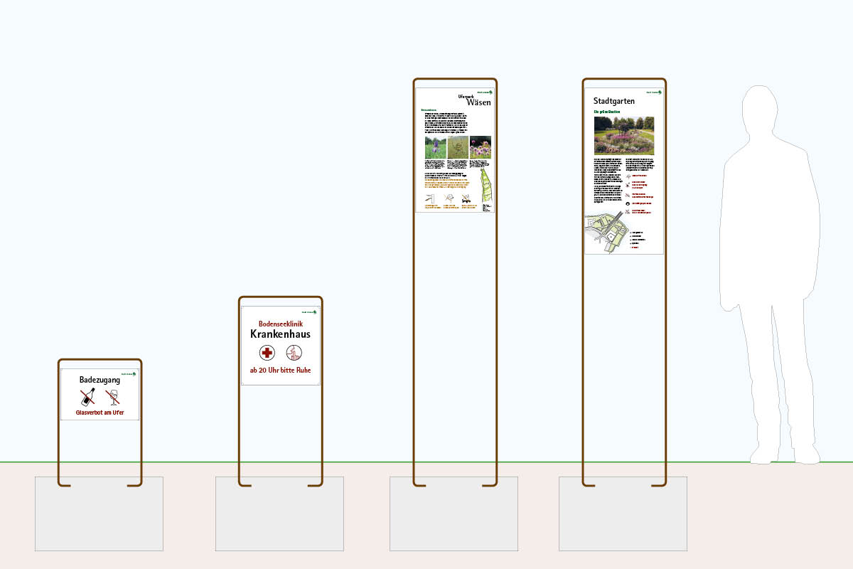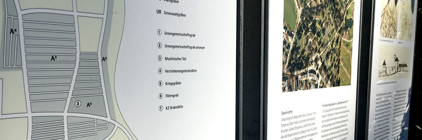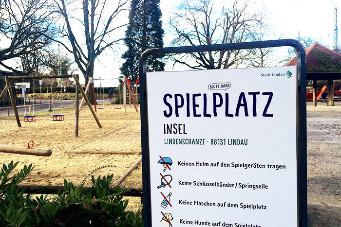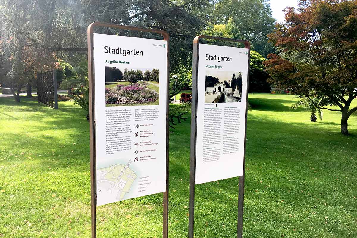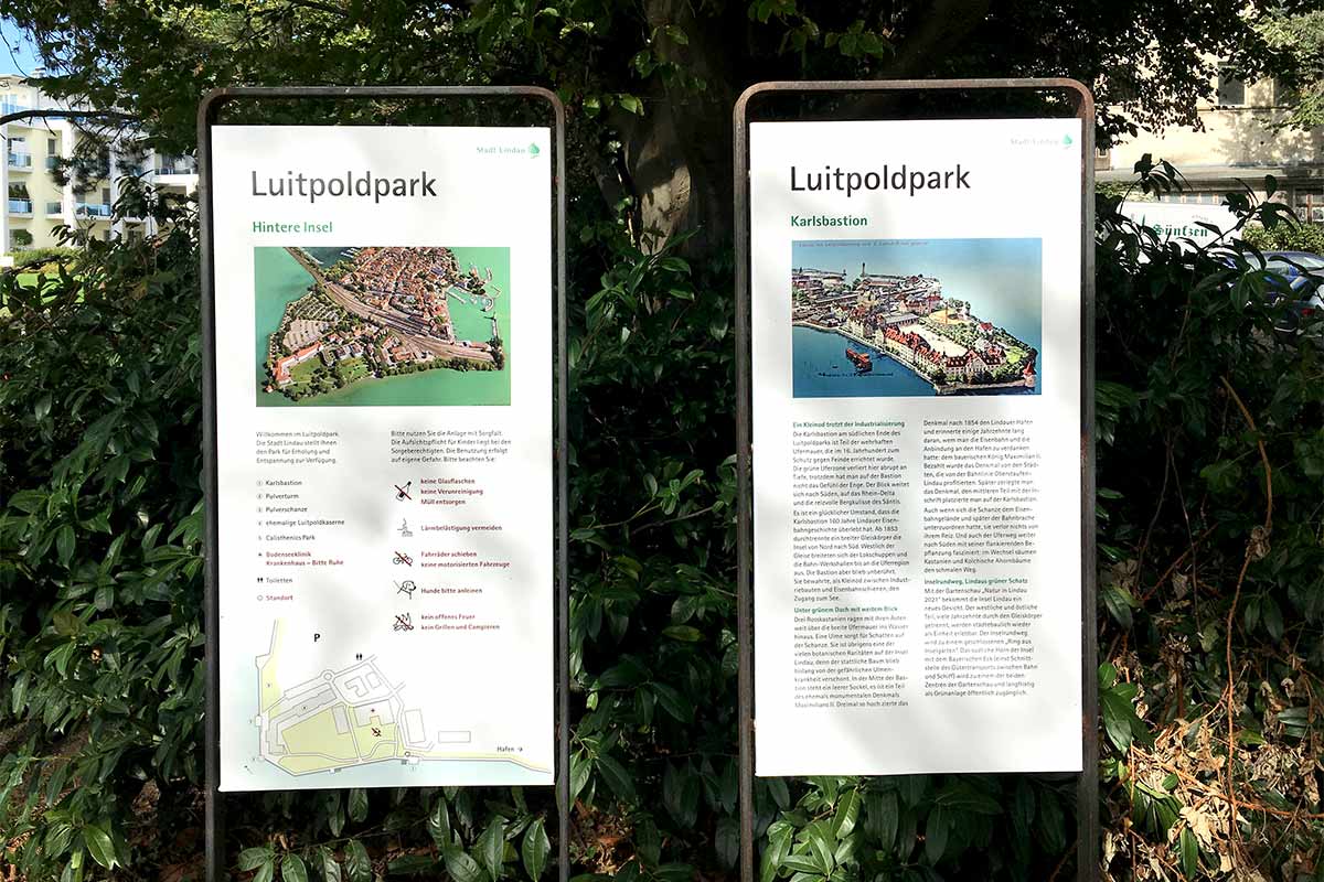 Für die Stadt Lindau entwickelten wir ein System von Infotafeln für die Parkanlagen, für die Spiel- und Bolzplätze und Pausenhöfe. An über 30 Standorten im ganzen Stadtgebiet informiert das Leitsystem Touristen und Einheimische mit aktuellen und historischen Inhalten.