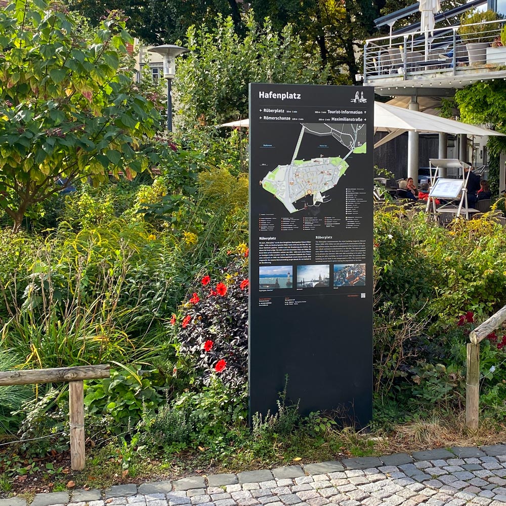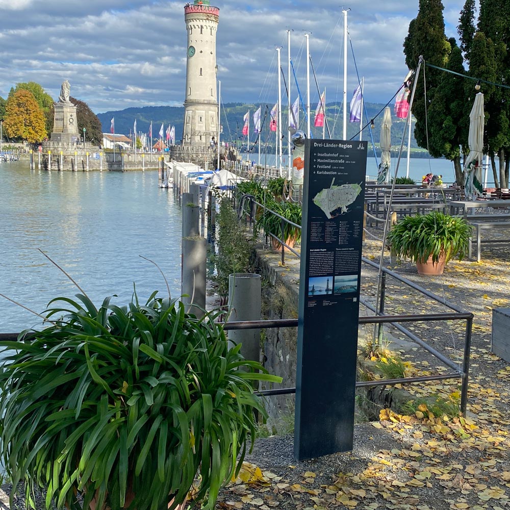 Für die Stadt Lindau entwickelten wir ein Fussgängerleitsystem. An Standorten im ganzen Stadtgebiet informiert das System mit Übersichtsplänen und kurzen historischen Texten.