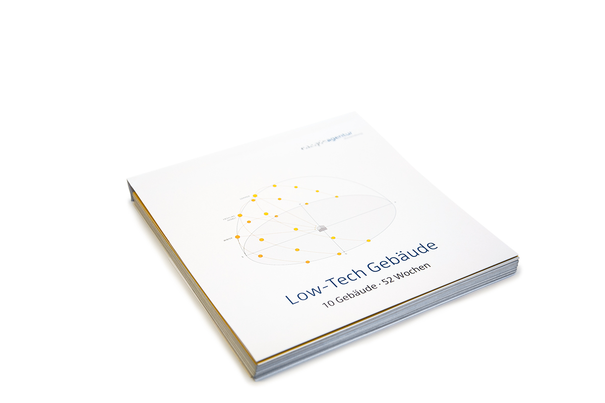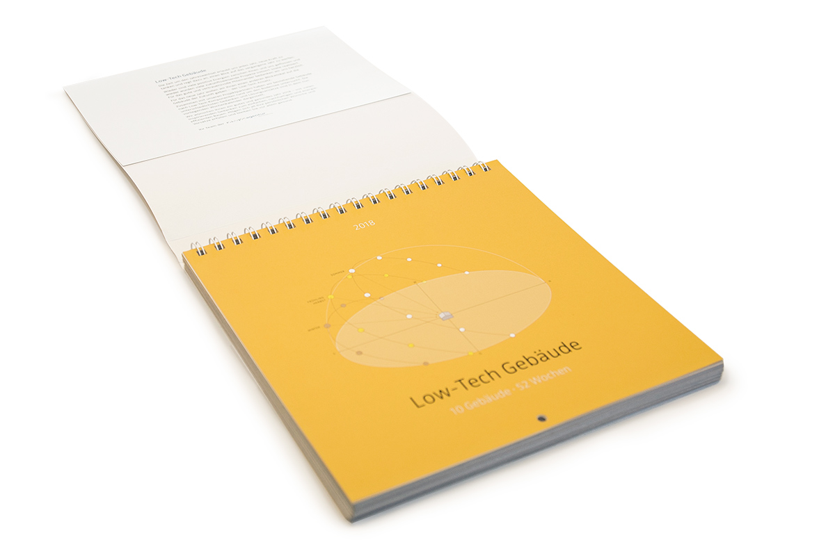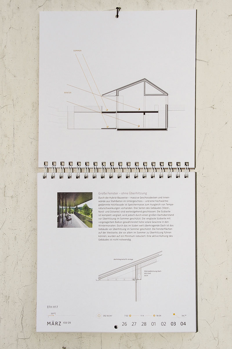 Anhand des Jahreslaufes werden verschiedene Inhalte rund um das Thema „Low Tech“-Architektur abwechslungsreich und informativ kommuniziert: Texte, Zitate, Fotografien, Pläne, Technische Zeichnungen, Informationsgrafiken ...