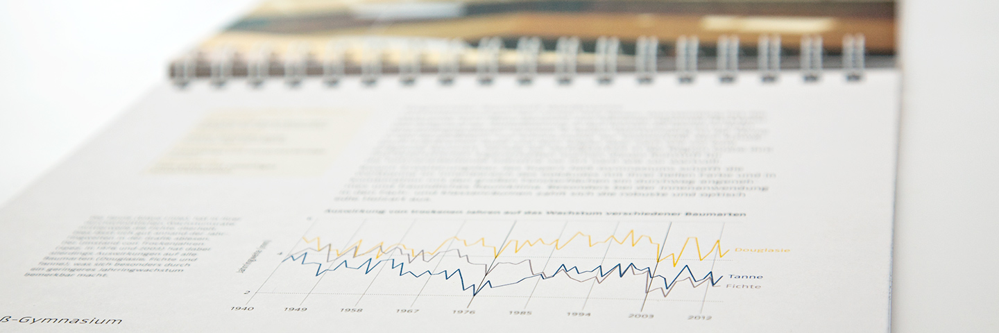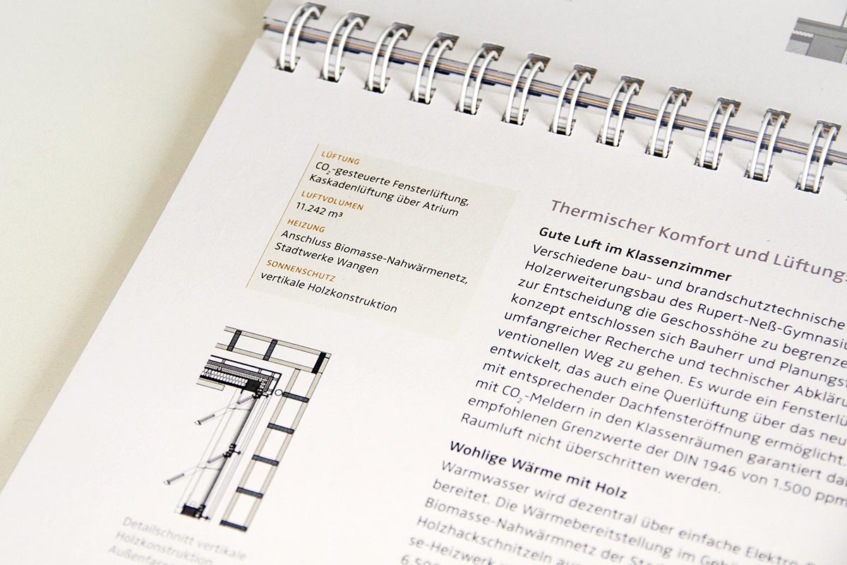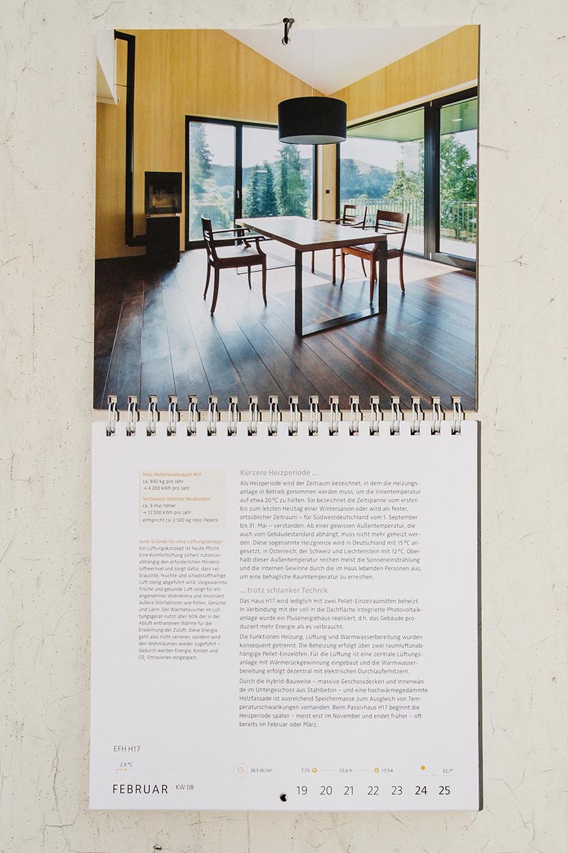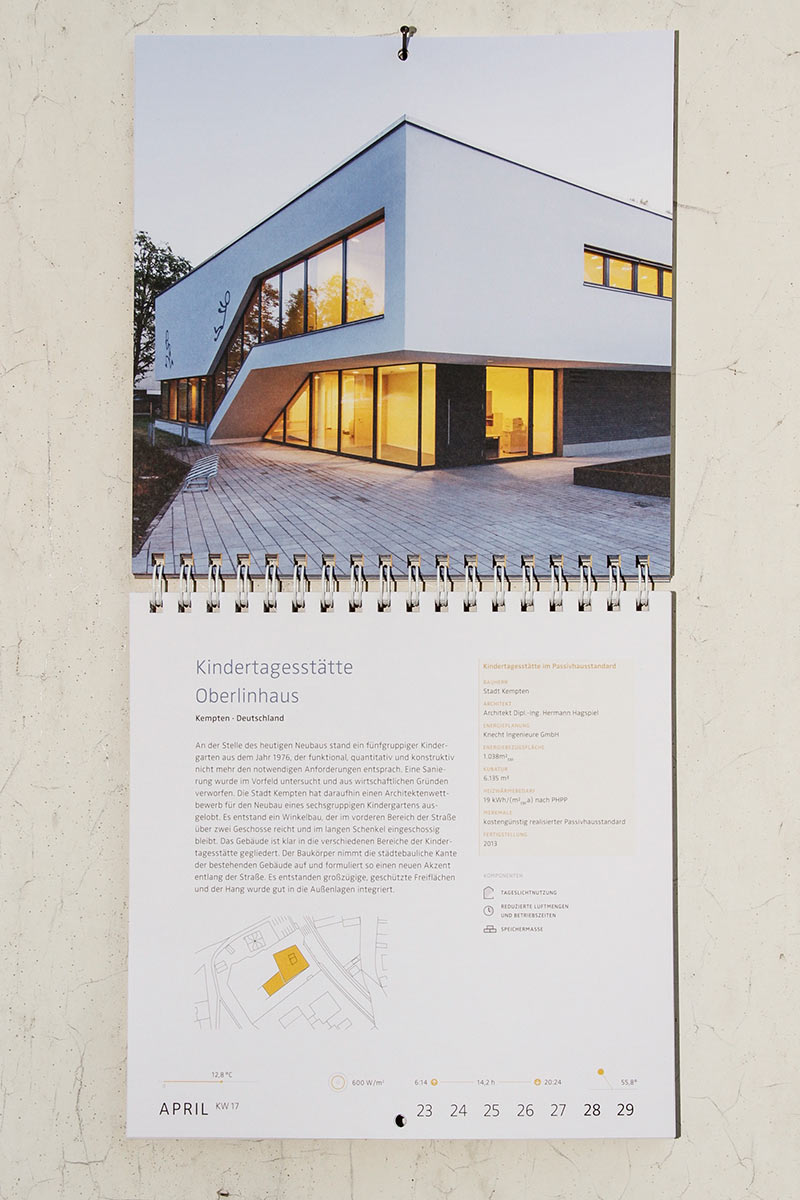 Anhand des Jahreslaufes werden verschiedene Inhalte rund um das Thema „Low Tech“-Architektur abwechslungsreich und informativ kommuniziert: Texte, Zitate, Fotografien, Pläne, Technische Zeichnungen, Informationsgrafiken ...