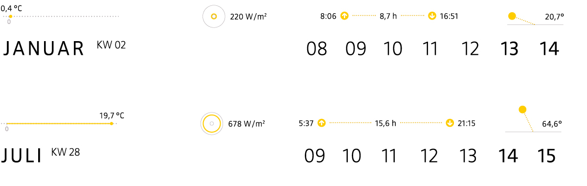 Mittlere Außentemperatur in der Woche, Mittlere maximale Sonneneinstrahlung, Sonnenaufgang, Sonnenstunden, Sonnenuntergang, Sonnenhöchststand
