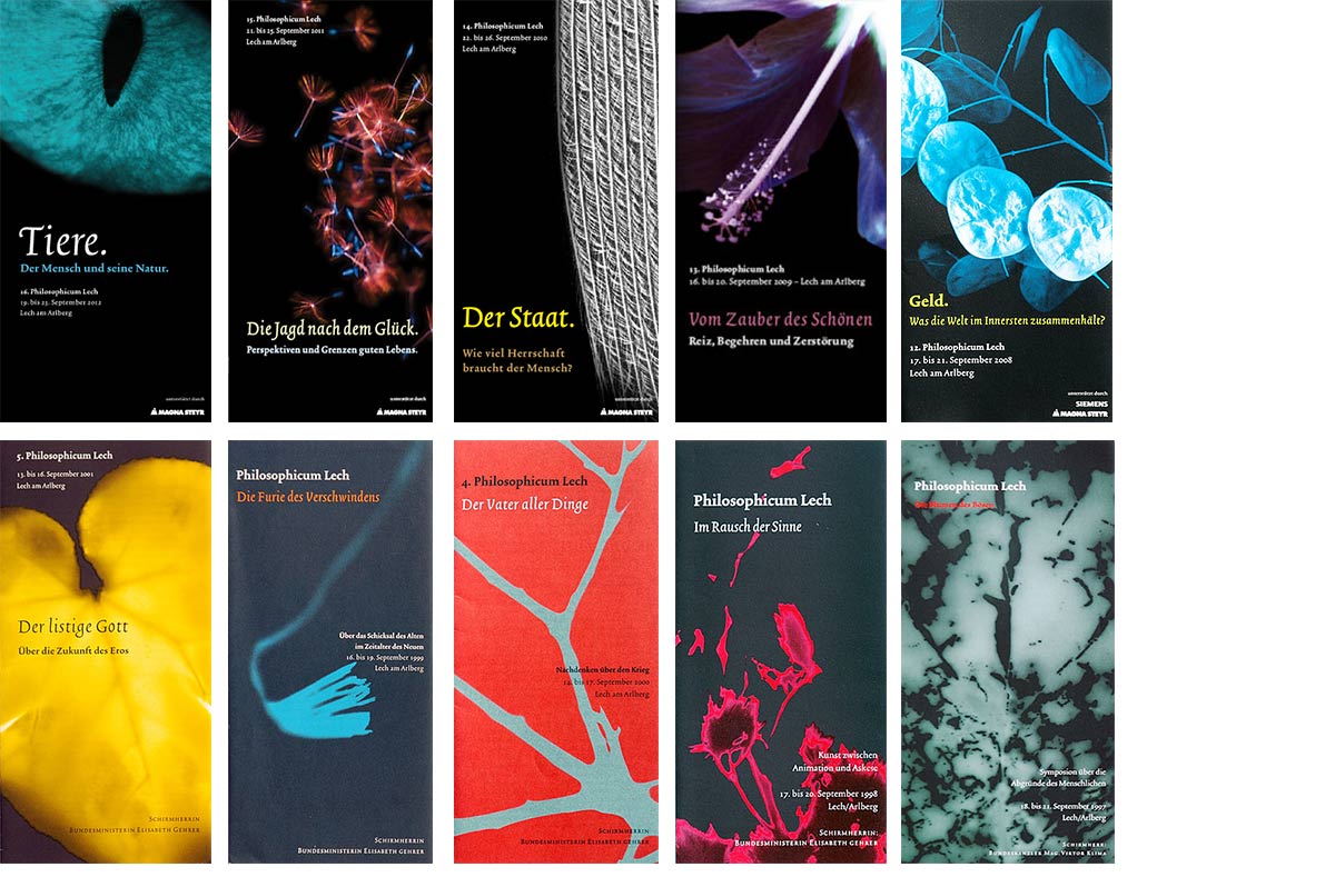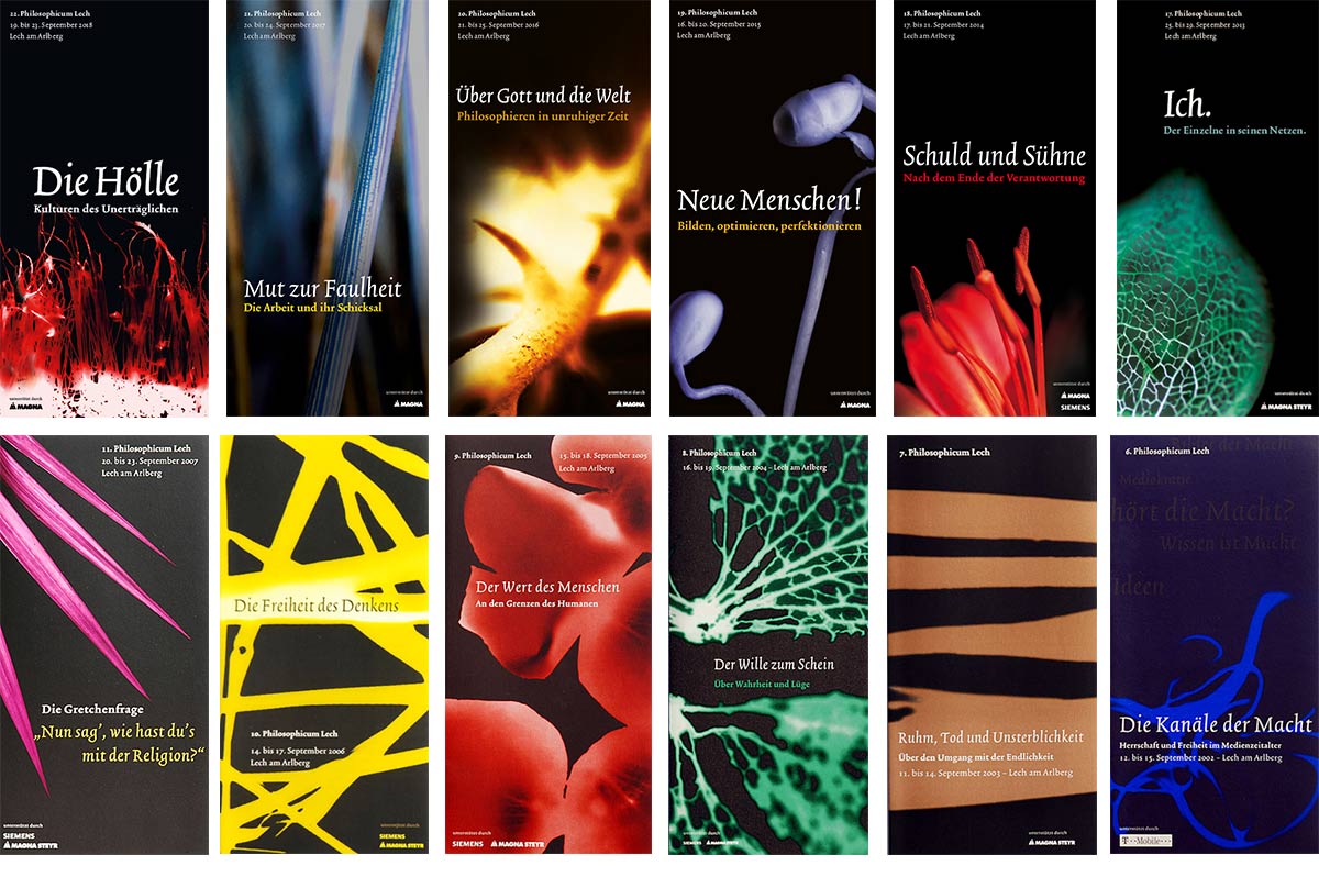 Seit seiner Gründung 1997 entwickelten wir für das Philosophicum Lech jährlich ein neues Motiv im Spannungsfeld von Natur und Philosophie.